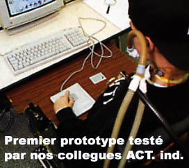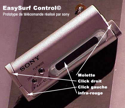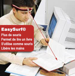 ES va plus loin encore ! En plus du bandeau, un petit objet ergonomique se tient en main au même titre qu’une télécommande, afin de disposer des fonctions avancées d’une souris classique. Cet objet que l’on tient en main est muni d’une molette et de deux boutons, vous permettant ainsi de faire tout ce qu’une souris peut faire sans avoir a gratter le sol comme un chien, à coté de votre clavier ! non ! c’est finit tout ça ! maintenant c’est avec la tête qu’on décide où l’on surfe ! enfin !