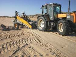 Dans le cas où la plage est équipée du système développé ici, le nettoyage de profondeur est d’une simplicité enfantine : il suffit de relier les 4 cables du filet le plus haut aux poulies, de relier un 4×4 ou un tracteur de chaque coté du filet, et de mettre le tout en marche. Le filet ainsi tracté va se soulever, et par un effet de tamis bien connu de tous, laissera retomber le sable en gardant prisonniers les déchets ainsi extraits du sol. Il ne reste plus qu’à vider le filet dans une benne, et remiser ce même filet, qui pourra resservir à la prochaine saison.